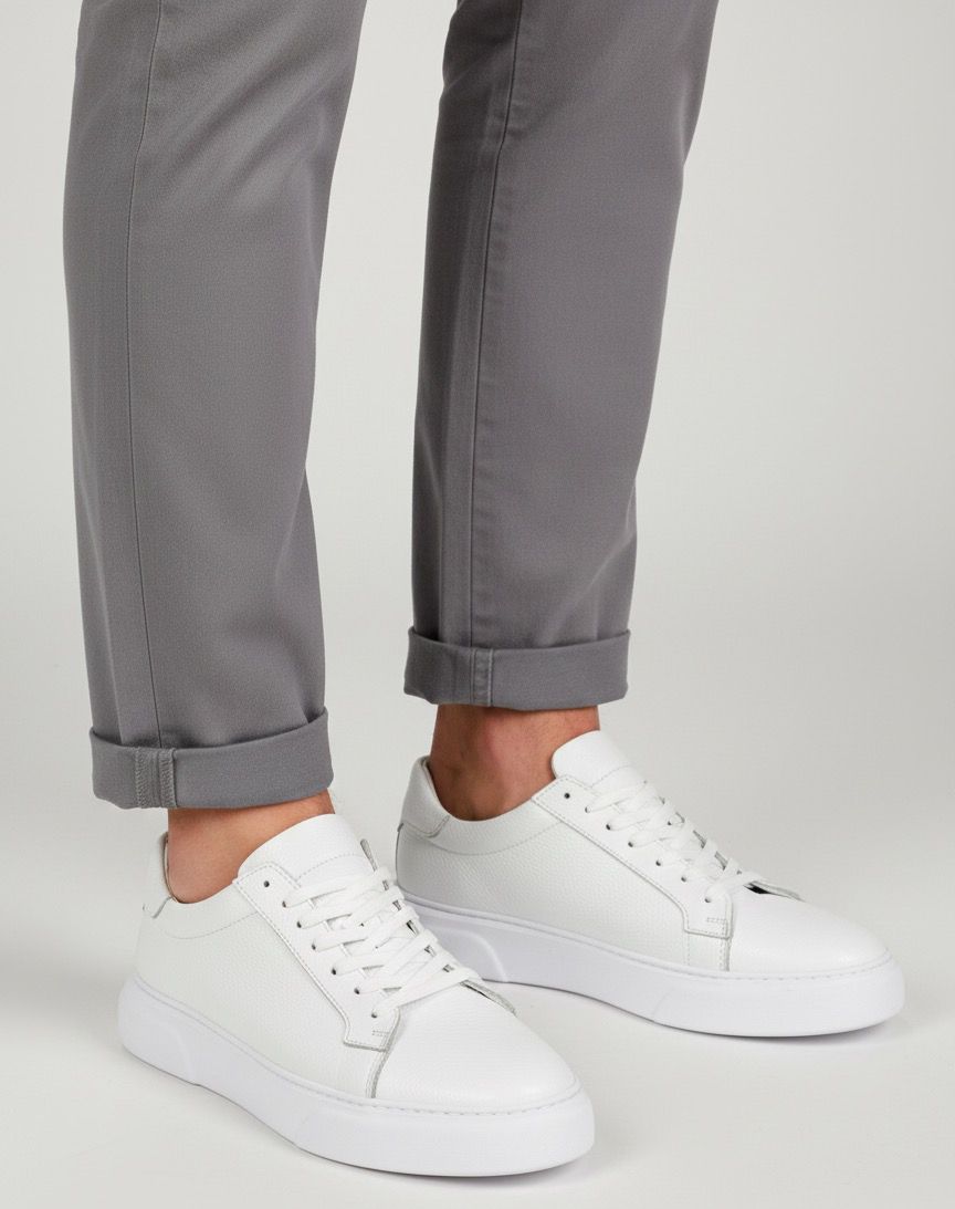 • Gri pantolon ve beyaz dokulu deri sneaker kombini