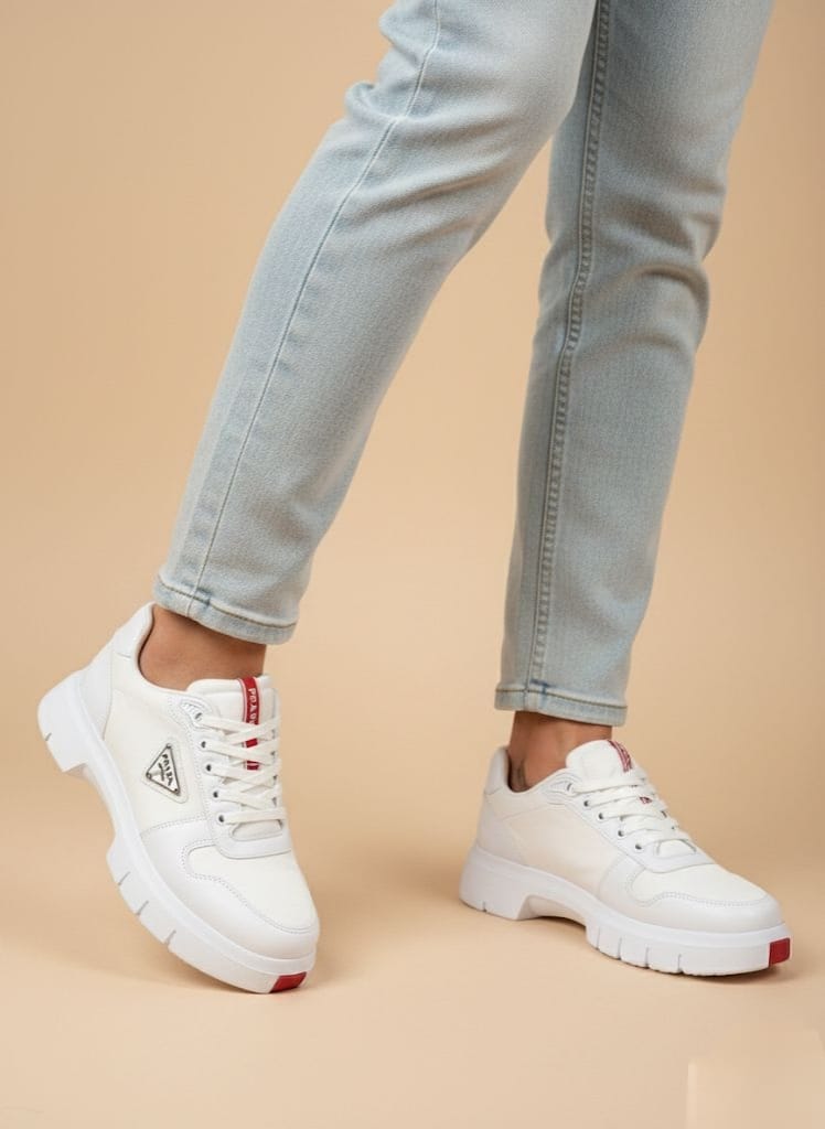 Beyazın temiz görünümünü lüks detaylarla zenginleştiren bu tasarım sneaker, stil sahibi erkeklerin tercihi. Yan kısımdaki gümüş çerçeveli üçgen amblem ve dildeki kırmızı şerit, bu modele dinamik ve prestijli bir hava katıyor.