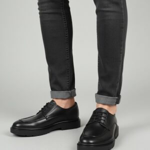 Klasik bağcıklı ayakkabı tasarımını modern sokak modasıyla buluşturan bu siyah Derby ayakkabı, her adımda stilinizi güçlendirir. Pürüzsüz dış yüzeyi ve karakteristik kalın tabanıyla hem ofis şıklığında hem de günlük kombinlerde fark yaratır.